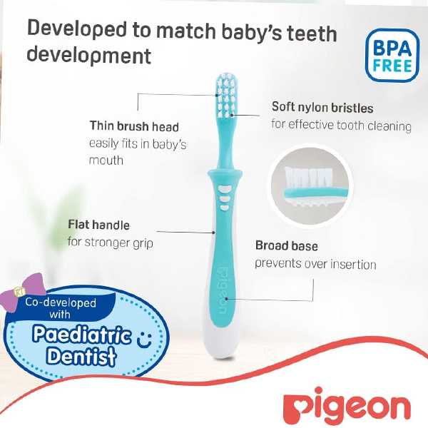 • Pigeon Baby Training Toothbrush Lesson 3 designed for toddlers learning to brush independently.