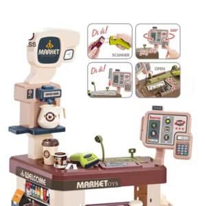 - Complete supermarket playset with a cash register, trolley, scanner, and grocery items.